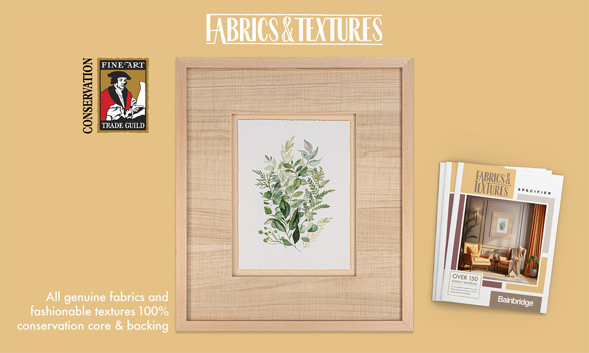 Bainbridge offers the most extensive collection of genuine fabrics and fashionable textures to clothe your art in style. Our Fabrics and Textures product line offers over 150 distinct materials, and all of them are made with 100% conservation core and backing.
