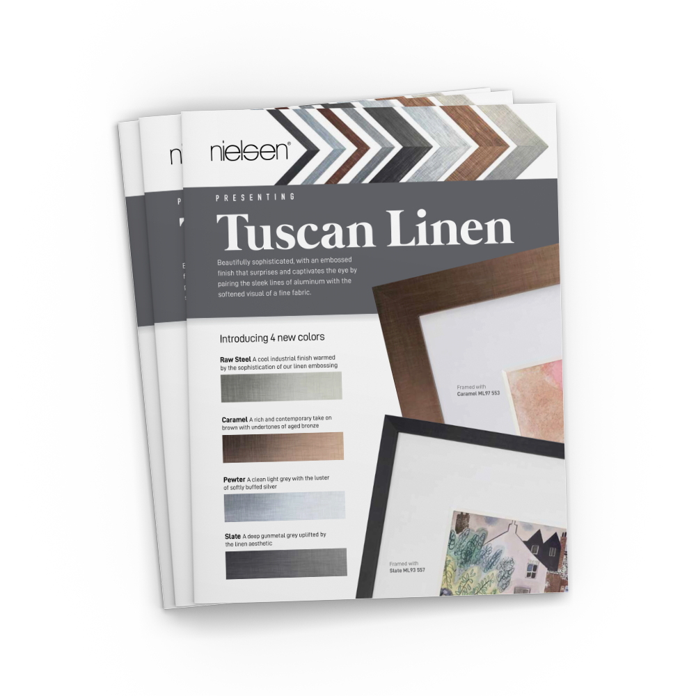 A uniquely elegant collection of mouldings, now featuring seven finishes for your most refined framing designs. Beautifully sophisticated, with an embossed finish that surprises and captivates the eye by pairing the sleek lines of aluminum with the softened visual of a fine fabric.